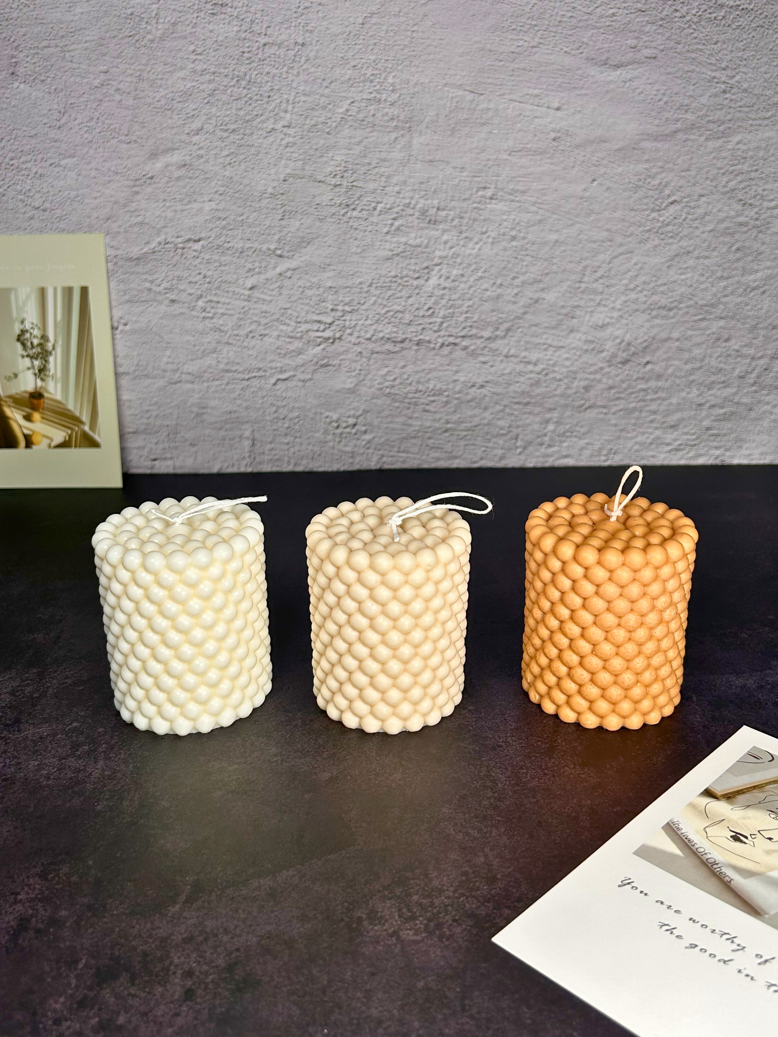Vela decorativa de cera vegetal con forma cilíndrica y textura pomposa que aporta estilo y carácter a cualquier ambiente. Su acabado mate resalta el volumen único del diseño, creando un toque elegante y contemporáneo, ideal para combinar o destacar por sí sola.
